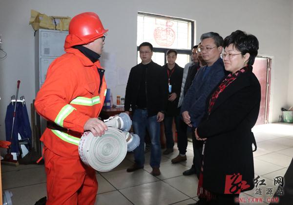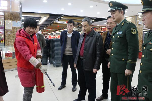 (涟源市委书记谢学龙(右一)现场抽查开成商悦广场消防人员消防知识和消防技能掌握情况)