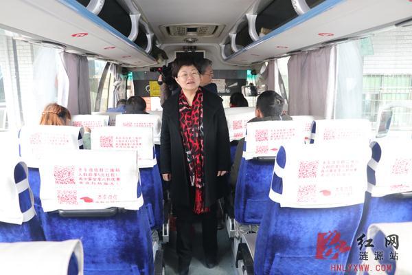 (在涟源市湘运汽车站,涟源市委书记谢学龙随机登上一辆涟源开往长沙的客运大巴,对车内的灭火器、应急逃生门拉手、安全锤等设施设备进行检查。)
