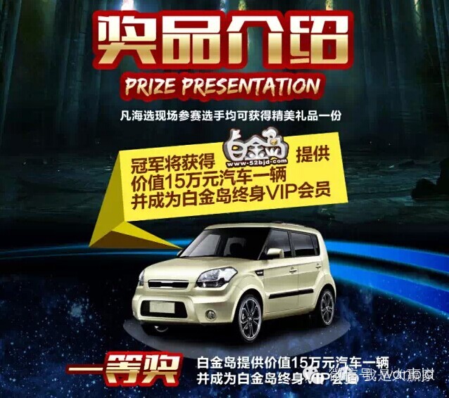 本次比赛的冠军大奖是价值15万元的豪华轿车一台,第二名获得价值1.5万元的全套家电,第三名将获得价值8000元的苹果笔记本电脑!