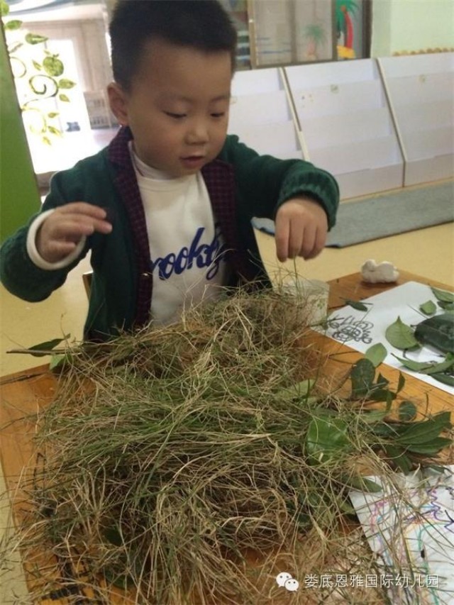 为了不局限孩子们的思维,只给他们提供了他们筑巢所需要的辅助材料,比如超轻粘土(代替泥巴)、剪刀等。他们一个个多充满了创造能力,迫不及待的动手干了起来。剪剪、拈拈、压压、揉揉,不一会儿功夫,小鸟、鸟蛋和鸟巢就完工了。