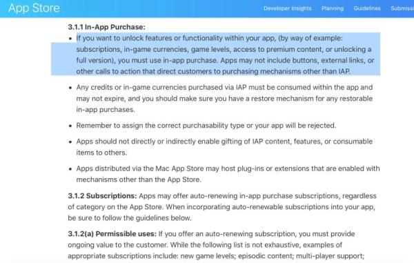 具体条例是:2016年6月13日,苹果应用商店(App Store)更新了3.1.1条款,更严格要求App不得包含指引客户使用“非IAP(in-app purchases,应用内购买)机制”进行购买的按钮、外部链接或其他行动号召用语。