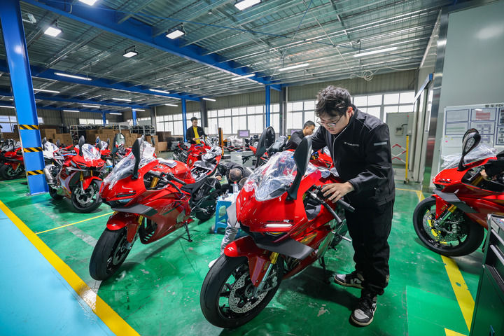 2026年4月1日,工作人员在重庆两江新区“张雪机车”生产车间对下线整车进行入库发车检测。新华社记者 黄伟 摄