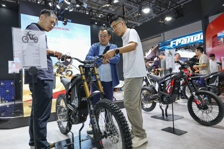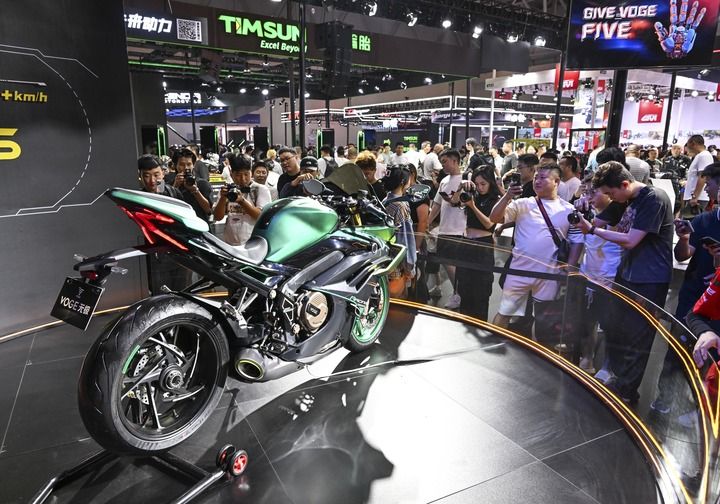 第二十三届中国国际摩托车博览会于2025年9月19日至22日在重庆举行。观众在现场参观国产新能源摩托车。新华社记者陈诚摄