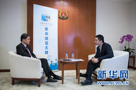 近日,新加坡贸工部长陈振声在新加坡接受新华网专访。图为陈振声(左)与本次访谈主持人、新华网新加坡负责人吴磊对话。新华网 王应耀 摄