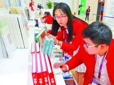 在进博会新闻中心,志愿者整理赠阅中外记者的书刊。本报记者 郭红松摄/光明图片