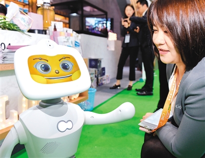 进博会上的Robelf小贝机器人同工作人员交流互动。新华社记者 李 贺摄